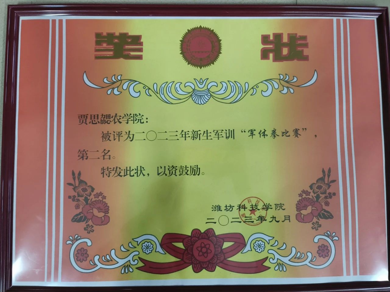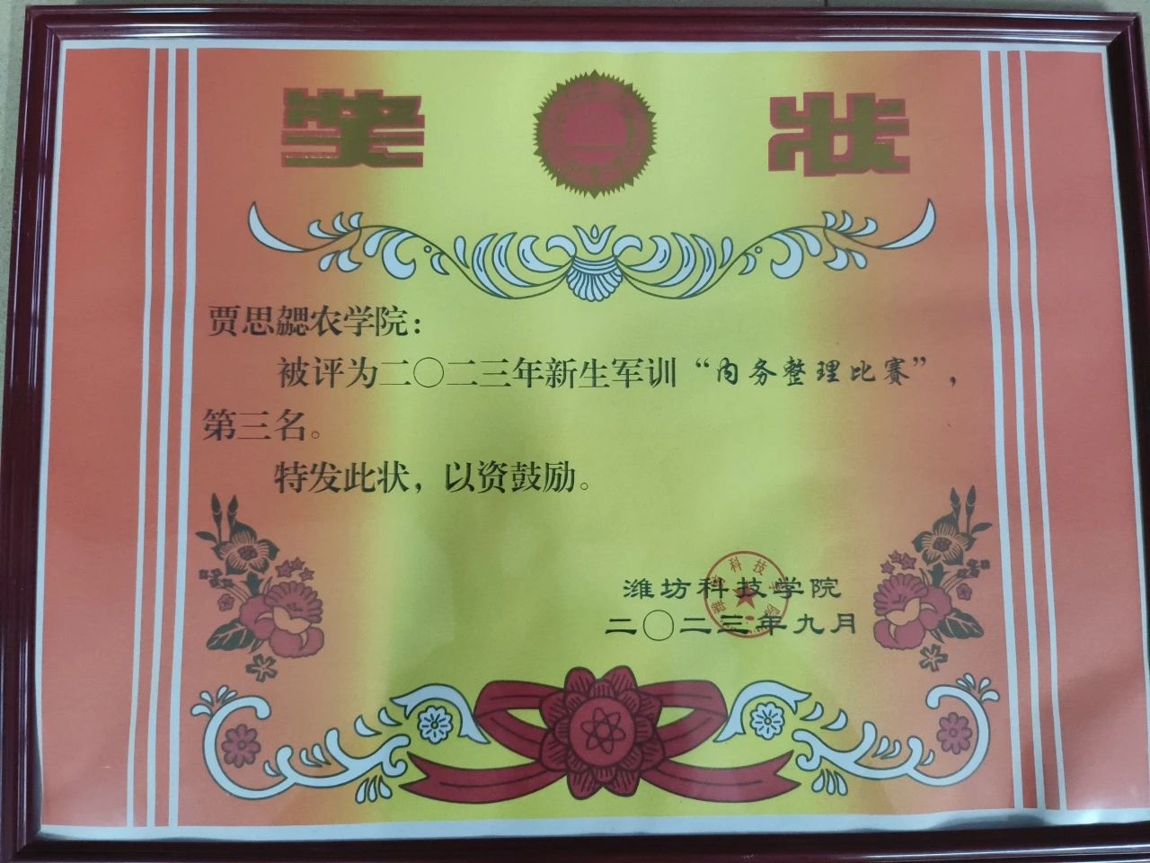 军训期间,农公司认真训练,踊跃参与各项活动比赛,最终取得了2023年新生军训“先进单位”、2023年新生军训“内务整理比赛”第三名、2023年新生军训“军体拳比赛”第二名的优异成绩。2138cc太阳集团官网入口生物技术一班陈浩冉同学作为优秀员工代表上台发言,她在表达对全体军训教官、助教感谢的同时,对接下来的老员工活进行展望,表示将在未来的每一天保持激情,勇往直前。