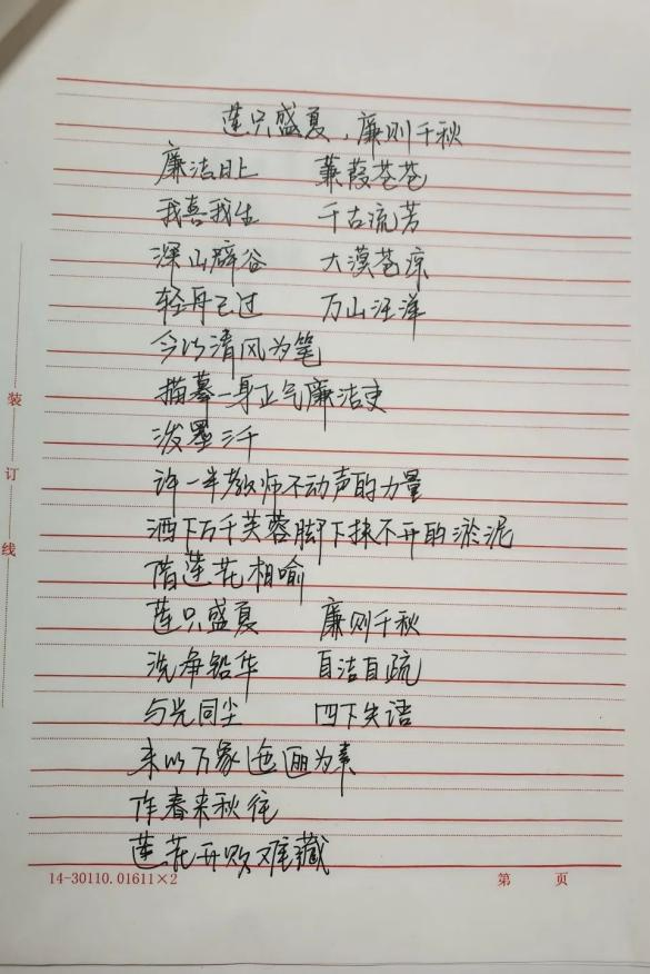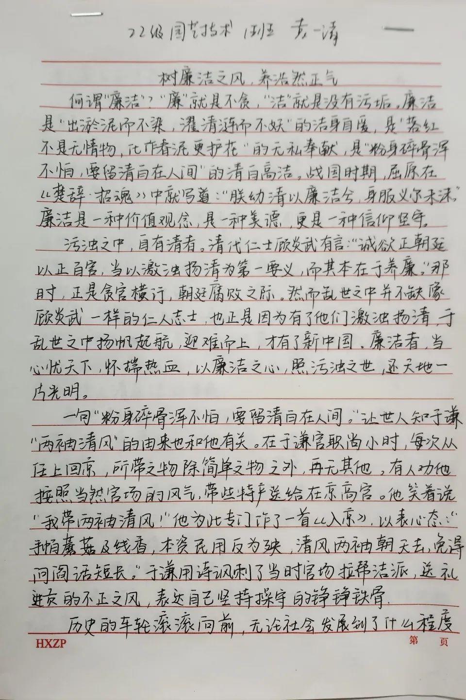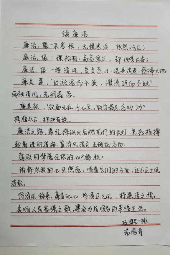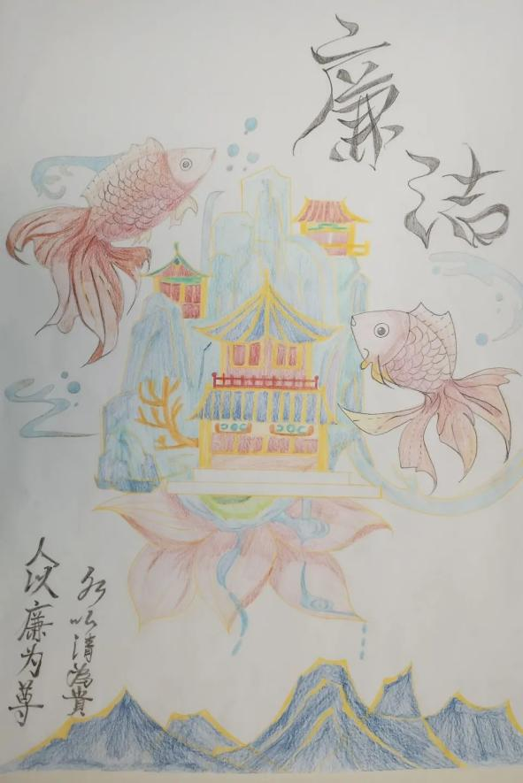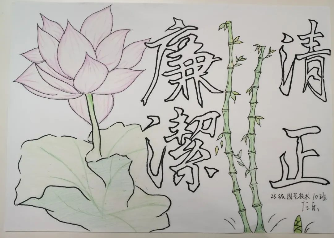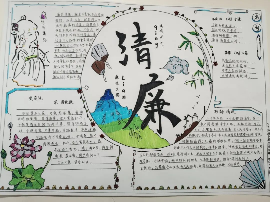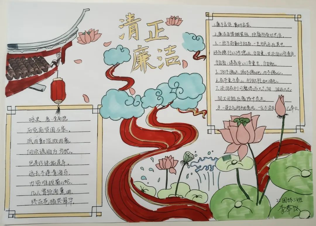 活动中,同学们通过不同方式表达对廉洁的认识。有些同学们将自己对坚守廉洁的信心勾勒在一副副生动的手抄报上,细腻的线条、惟妙惟肖的图画、巧妙的构图,无一不透露着同学们崇廉尚洁的信心与决心;除此以外,同学们还通过铿锵有力的汉字来表达自己对于廉洁文化建设的支持,“飘若浮云,矫若惊龙”的文字在纸张上活灵活现,端庄大方的字体,优美流畅的线条,字里行间都流露着同学们对赓续绵延廉洁正气的决心。