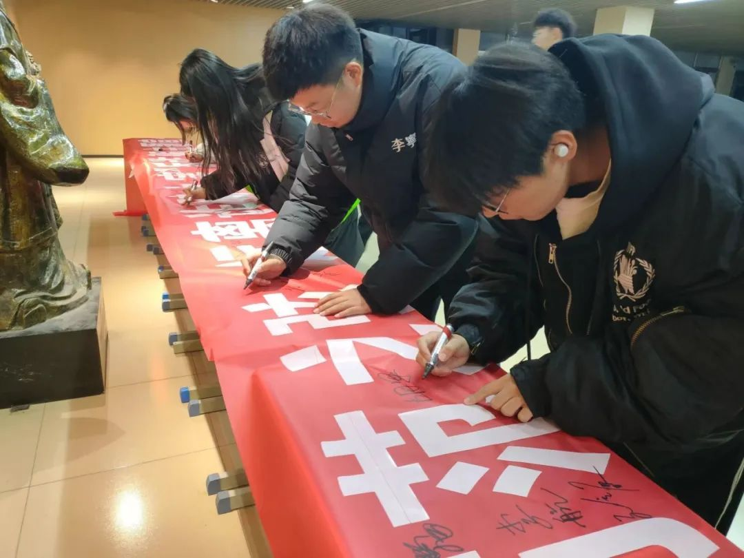 在活动过程中,为调动同学们的积极性,葛树喆老师向同学们介绍了此次活动的重要意义,并提醒大家在日常生活中要时刻怀有警惕之心,最后大家在横幅上郑重地签下自己的名字,横幅上密密麻麻的名字,不仅是签下一份承诺,一份责任,更能体现出同学们对于防范电信诈骗的信心。