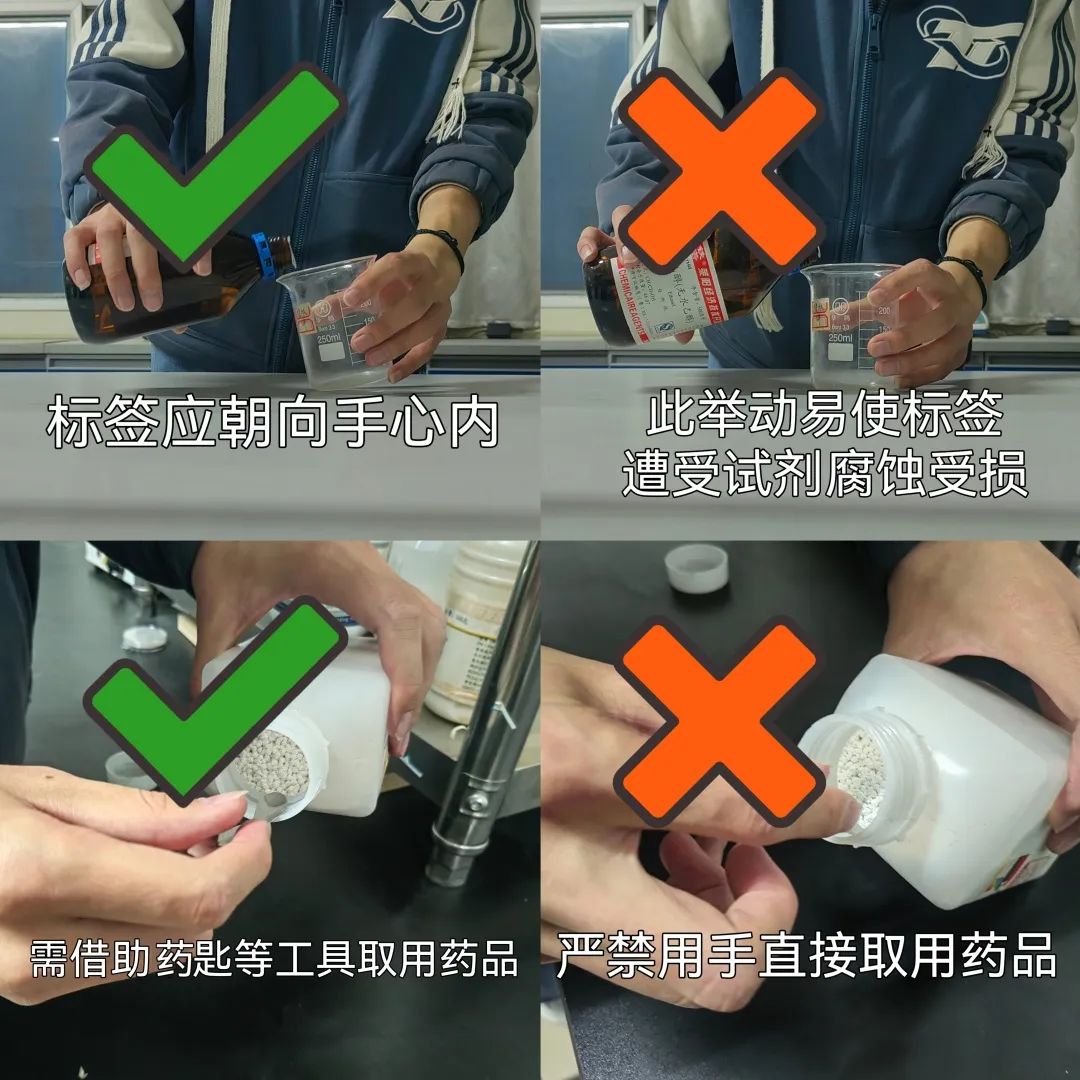 取用腐蚀或刺激性化学试剂(如强酸、强碱、氨水、冰醋酸等)时,尽可能戴上橡胶手套和防护眼镜,禁止裸手拿取。倾倒时,切勿正面俯视。