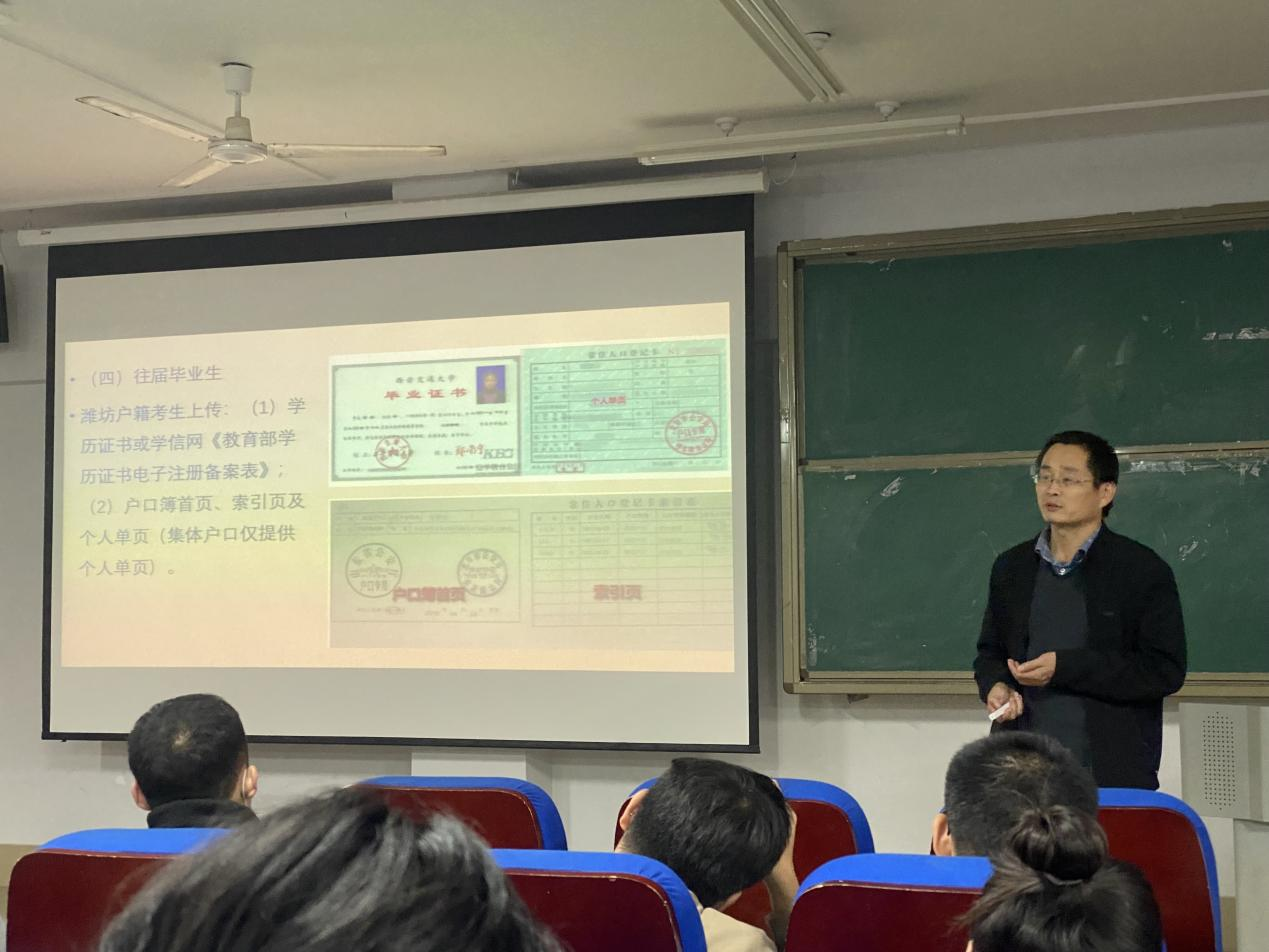 会议伊始,李建永书记详细讲解了2023年硕士研究生考试潍坊市招生考试院报考点网上确认步骤,提醒同学们提前准备好证件照、身份证及其他相关材料照片,在规定时间内完成网上信息确认;随后李老师对考前50多天的复习做了进一步的动员,李老师讲到:2138cc太阳集团官网入口的每一位老师与同学们同在,希望同学们讲究科学的备考方法,真题利用最大化,高效利用笔记;顶住压力坚持梦想。