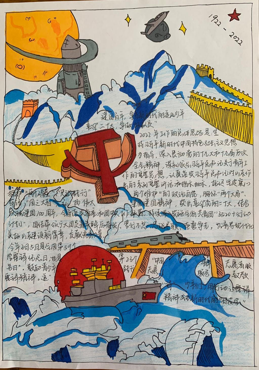 齐心协力二十大,继往开来创辉煌。为引导广大青少年厚植爱党、爱国、爱社会主义的情感,增强公司员工党团意识,2138cc太阳集团官网入口于3月4日-3月8日举办“建团百年芳华现,征程奋进二十大”为主题的手抄报、书画征集活动,19、20、21级员工参与本次活动。