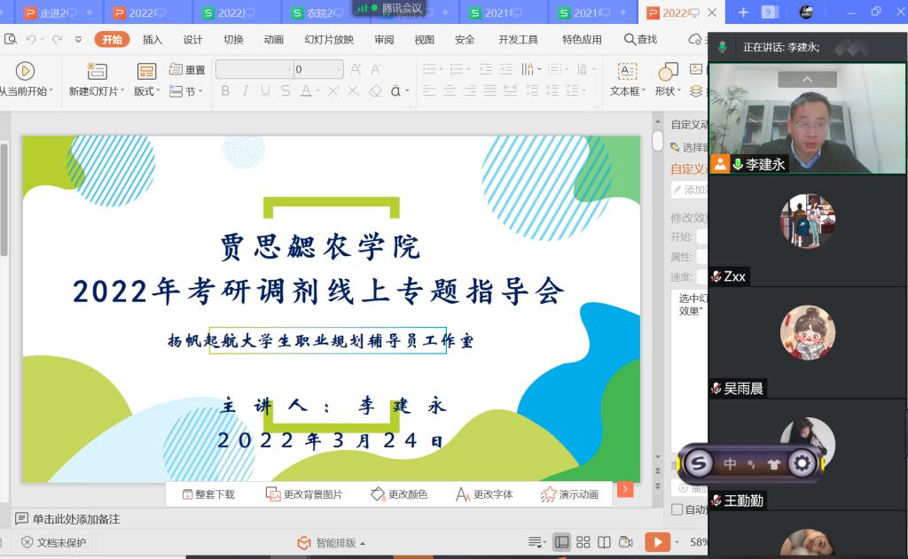 李建永老师分析了2022年农公司考研基本情况,介绍了公司2021年考研调剂取得的成绩,结合多年考研指导工作经验,就考研调剂和复试重要性、注意事项、把握原则和经验技巧向员工们作了详细讲解,并对复试调剂院校选择做了详细的分析和介绍。希望大家稳打稳扎,踏实高效地继续做好考研复试及调剂工作,并提出了四点建议: