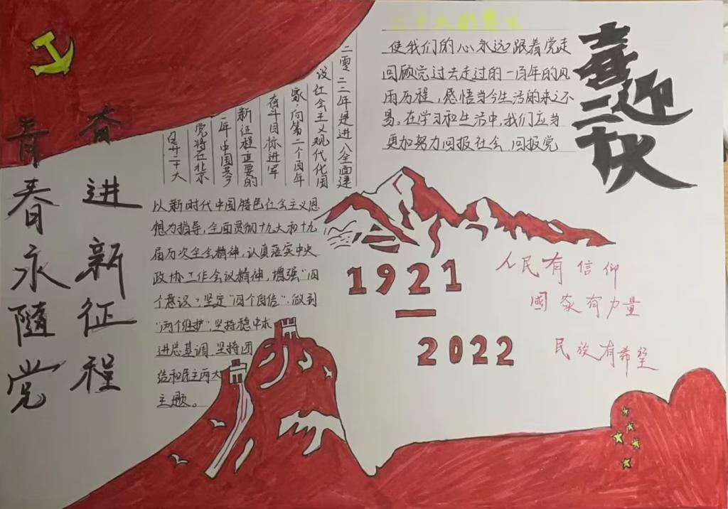 百年芳华二十大,红日征程又扬帆。为了培养同学们爱国爱党精神,提升同学们的民族自豪感,提高同学们红色艺术的创作能力,2138cc太阳集团官网入口于10月12日举行了“喜迎二十大,奋进新征程”手抄报活动,参加人员为21级,22级全体同学。