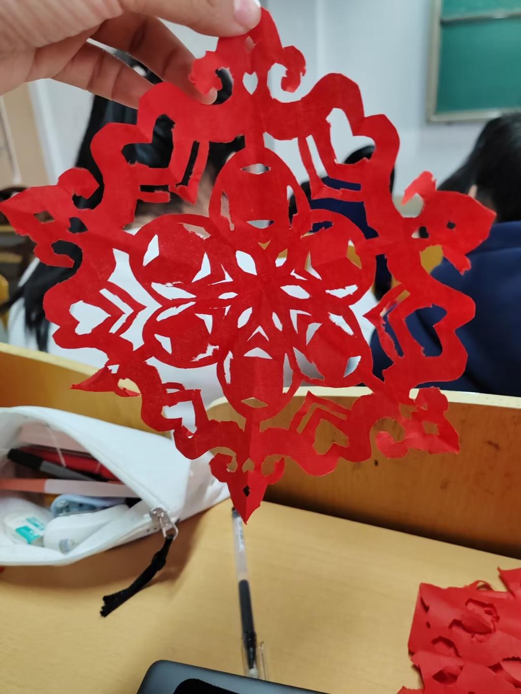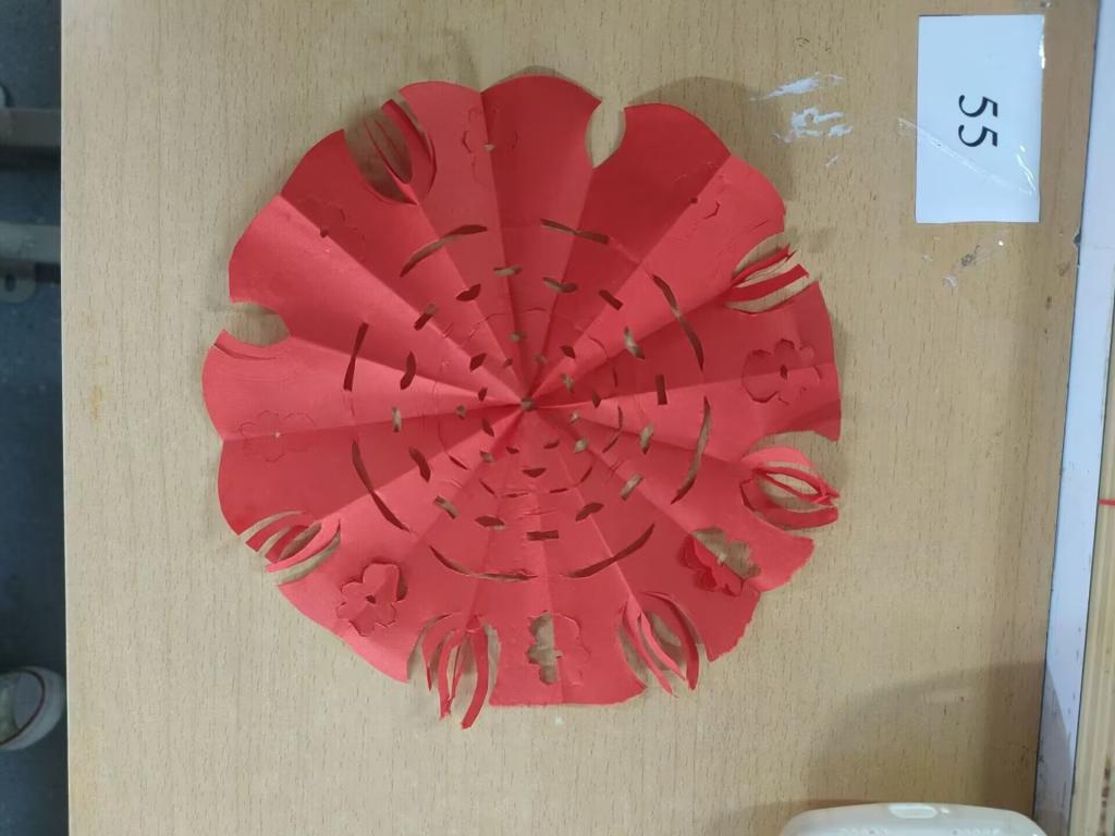 在本次的活动中,同学们聚精会神,按照教学步骤,折好图形,操控着手中的剪刀从内往外,从简到繁,一把剪刀、一张纸在同学们的手中发挥出无穷的想象力,随着纸张在同学们手中轻盈地翻转、跳动,一幅幅精美的作品呈现在大家面前,既有艺术形式的美,又饱含着同学们对民族传统文化的自信。