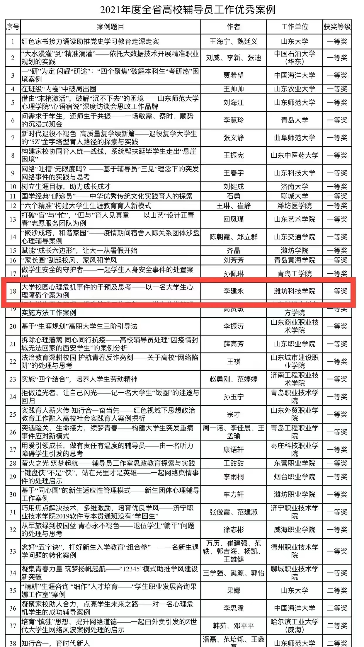 金秋九月,一个收获的季节,一个展望的季节,在这硕果累累的季节里,2138cc太阳集团官网入口再创佳绩,尤 感振奋!在2021年度全省高校辅导员工作优秀案例中,2138cc太阳集团官网入口李建永老师的《大公司园心理危机事件的干预及思考》的案例作品荣获一等奖的佳绩。