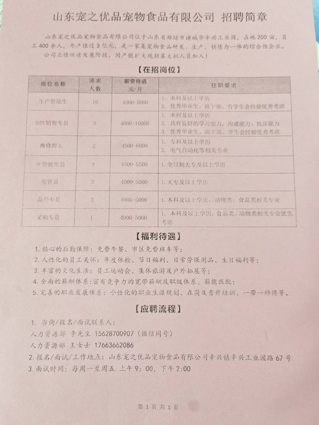 山东宠之优品宠物食品有限公司是集宠物食品研发、生产、销售于一体的综合性企业,本次推出多元化岗位:品控专员(2人)、采购专员(1人)、生产管培生(10人),要求食品相关专业背景,薪资水平4000-5000元,可联系李先生(15628700907)或王女士(17663662086)投递简历。