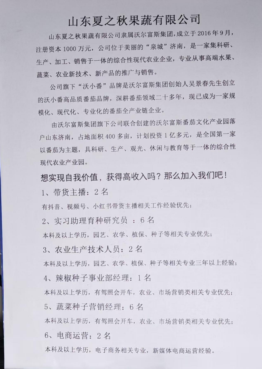山东夏之秋果蔬有限公司 是一家集科研、生产、加工、销售于一体的综合性现代农业企业,专业从事高端水果、蔬菜、农业新技术、新产品的推广与销售。招聘实习助理育种研究员(6人)农业生产技术人员(2人)蔬菜种子营销经理(6人)。专业要求本科及以上学历,农学相关专业。