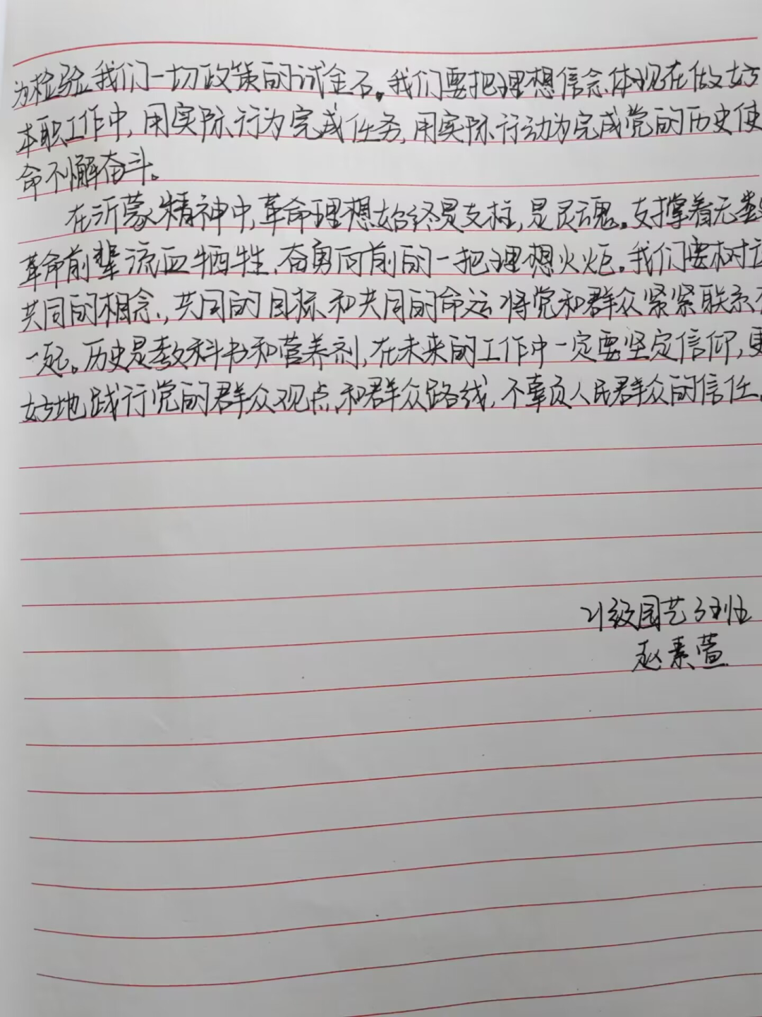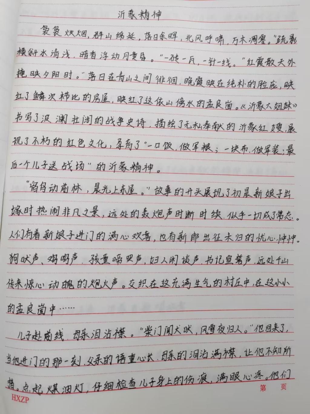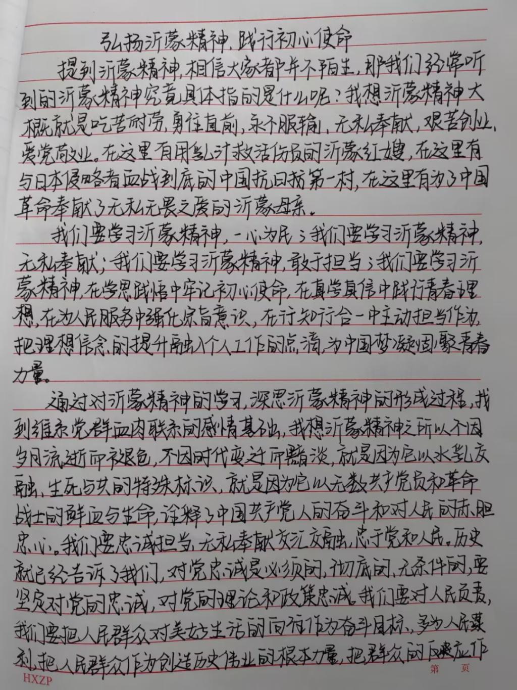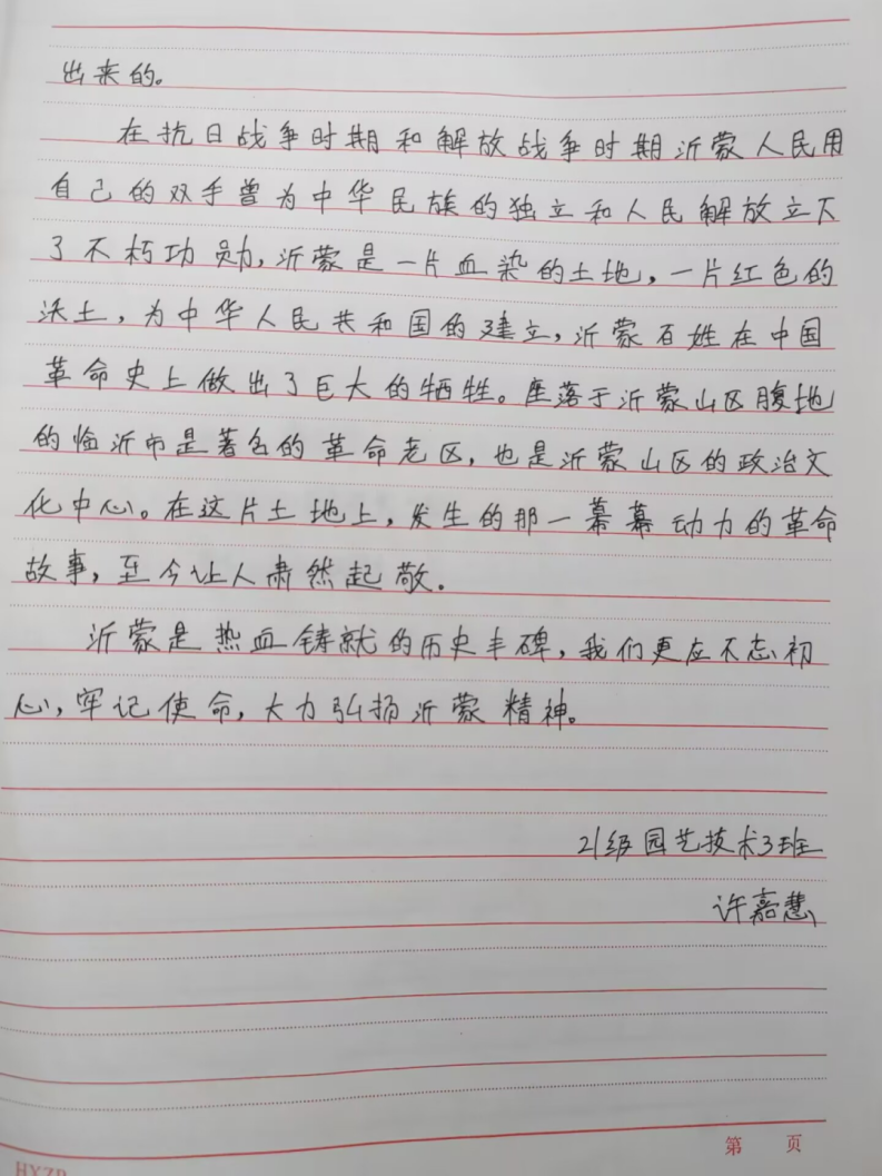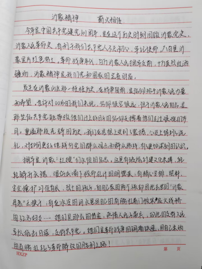 沂蒙精神是伟大的红色革命精神,是中华民族优秀文化的重要组成部分,同学们通过文章的形式以“弘扬沂蒙精神,践行初心使命”“沂蒙精神,薪火相传”等为主题,充分认识到作为新时代青年,应深知幸福的生活来之不易,应无比珍惜,要时刻铭记先辈们艰苦奋斗、爱党爱军的历史,学好本领,建设家乡,弘扬爱国主义精神,并以此引导身边的同学立足本职岗位,争创时代伟业,奋斗青春、不负韶华,追逐梦想、不负时代,走好新时代的长征路!