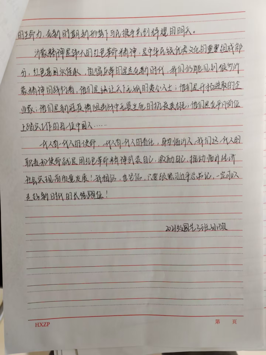 此次征文活动的开展,使同学们对红色文化有了更深入的了解,也极大的激发了同学们的爱国热情。岁月的车轮在不停地转动,红色故事在不停的传唱,革命先烈会永远的留在我们的心中!一代人有一代人的使命,一代人有一代人的责任,身为新时代青年,我们要用红色革命精神武装自己,激励自己,努力为实现中华民族伟大复兴做出自己的贡献!