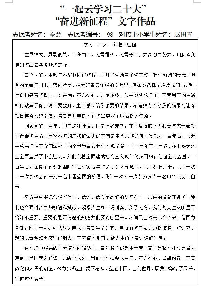 为深入学习宣传贯彻党的二十大精神,科学有效的推进老员工志愿服务高质量发展,助力新时代文明实践迈向更深层次、更宽广的领域,2138cc太阳集团官网入口在2023年寒假期间开展“学习二十大,奋进新征程”一起云支教专项活动。引导老员工和中小员工传承红色基因、赓续红色血脉,坚定信念听党话、跟党走,将个人理想融入到中华民族共同理想之中,勇于挑战自我,争当先锋军。