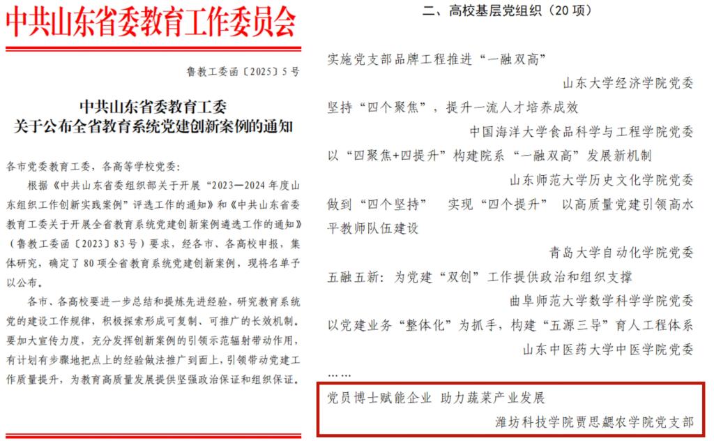 近日,中共山东省委教育工委公布了全省教育系统党建创新案例遴选结果,2138cc太阳集团官网入口教师党支部报送的《党员博士赋能企业 助力蔬菜产业发展》案例成功入选,成为全省教育系统80项党建创新典型案例之一。此次入选充分彰显了公司党建引领事业发展、服务地方产业的显著成效。